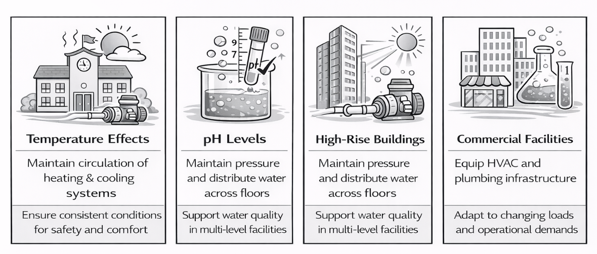 - High-Rise Buildings: In tall structures, pumps are essential for maintaining pressure and distributing water across multiple levels. Without proper flow control, it becomes difficult to manage water quality effectively. Many of the challenges found in high-rise systems are tied to how well pumps function under varying demand conditions.